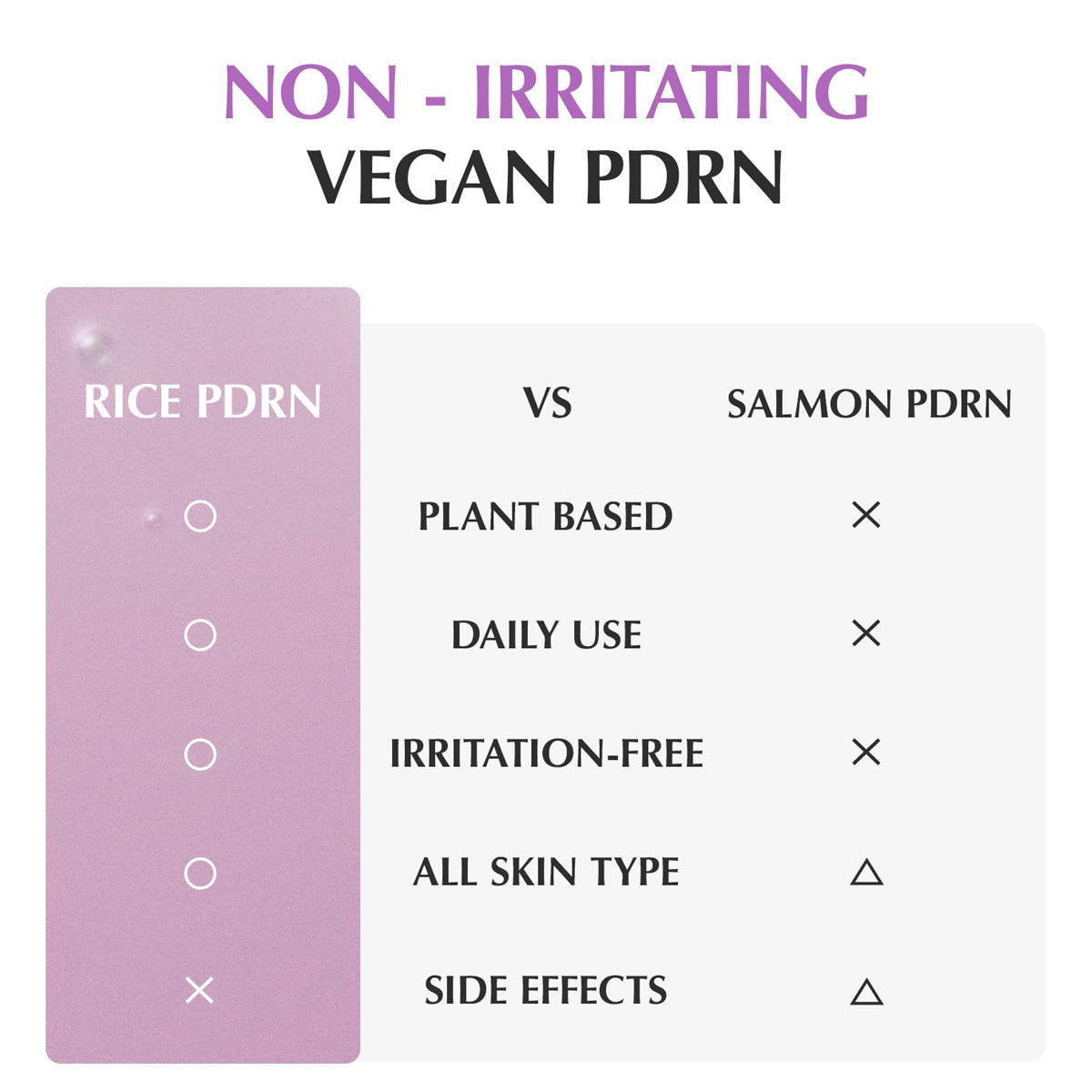 - Purple Vegan PDRN (rice-derived) – promotes skin regeneration and tightens the appearance of pores.